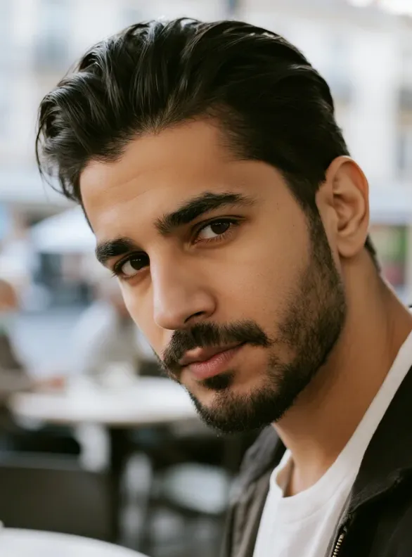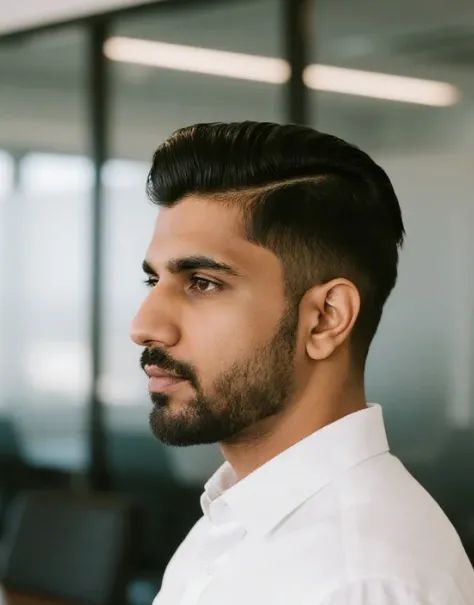 This is for the guy who knows the value of a good barber. And someone who appreciates clean lines and a style that speaks volumes without saying a word. It’s for the modern man, not afraid to embrace a bit of classic cool. The precision of that Pompadour Fade is what truly sets it apart; it’s confident, stylish, and undeniably sharp. A simple white tee never looked so good.